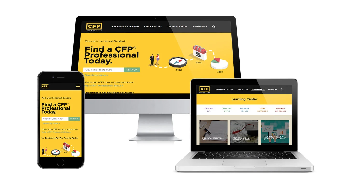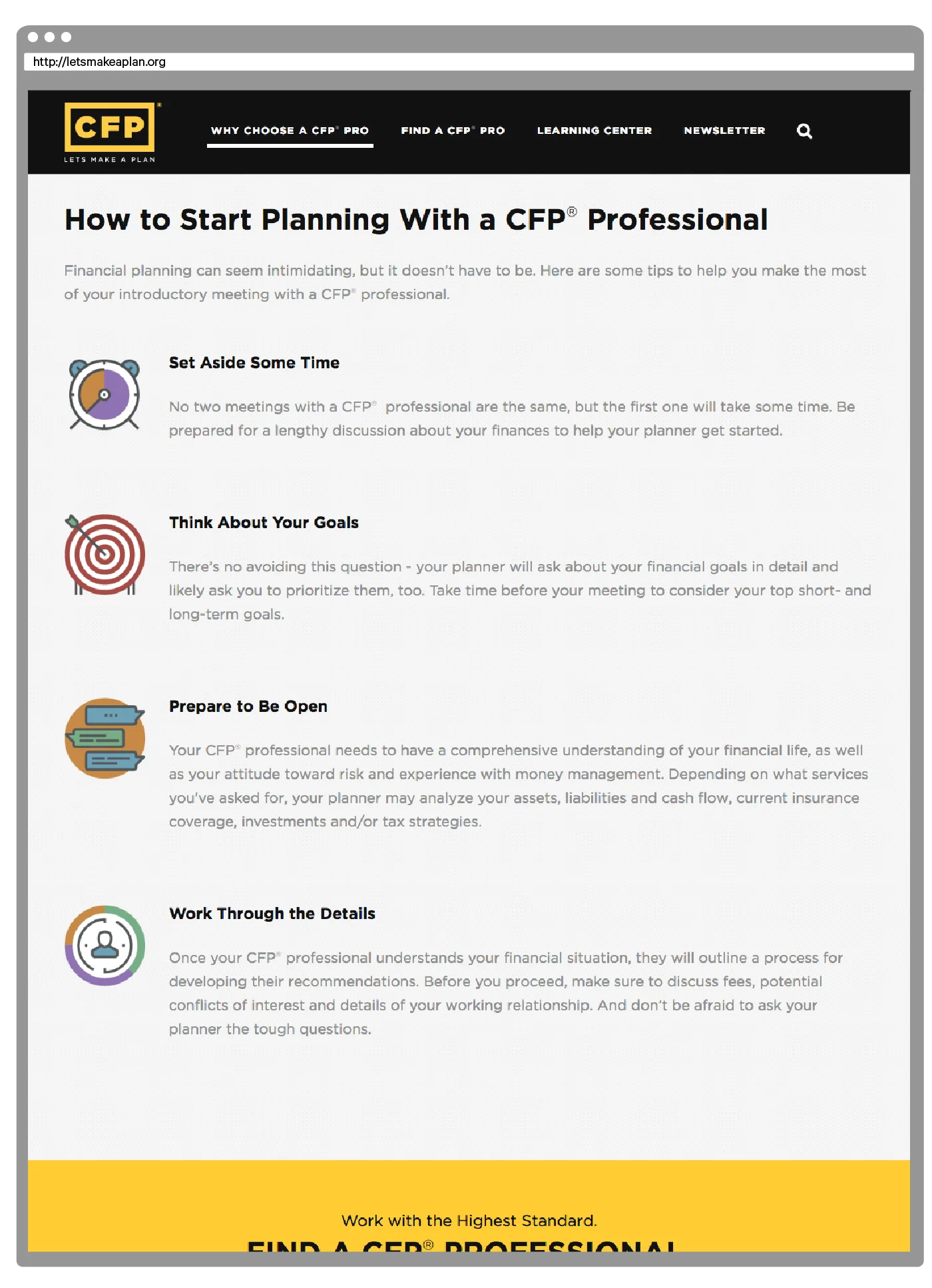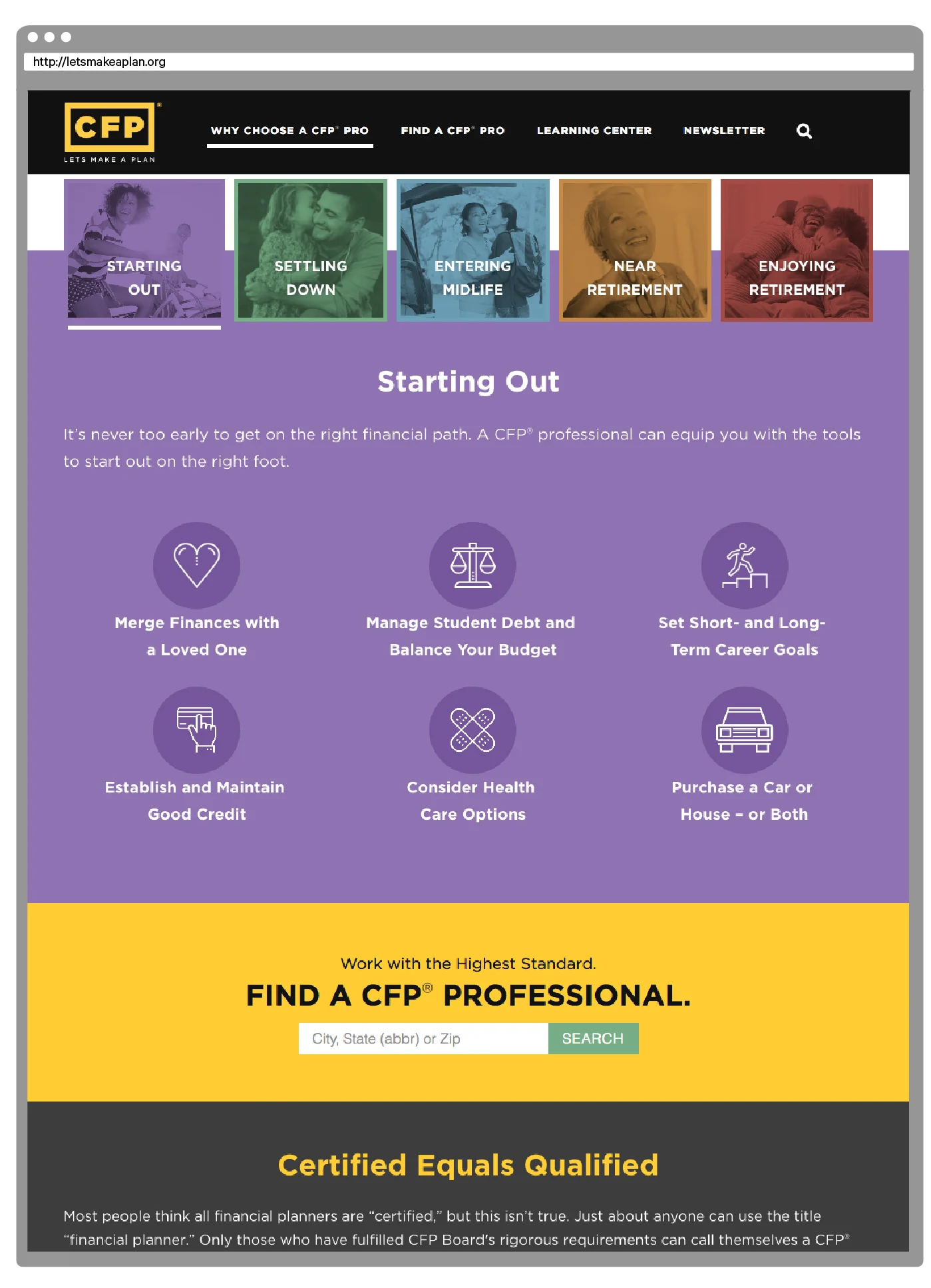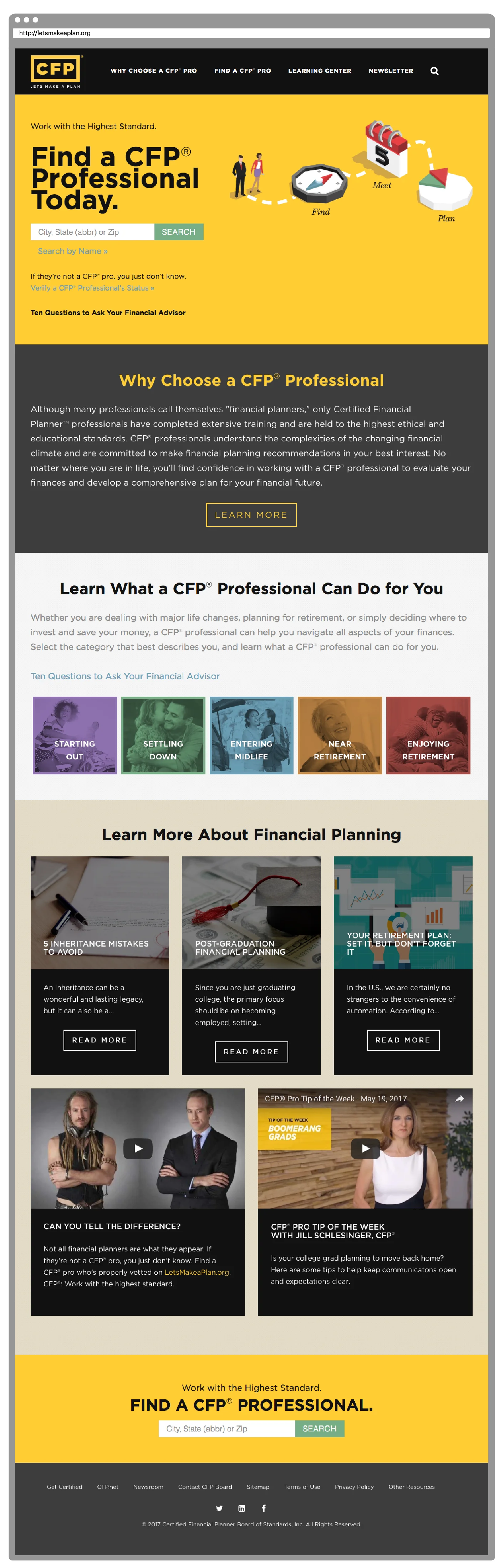 The Certified Financial Planner Board wanted to relaunch their consumer facing website with a dual focus. First and foremost they wanted to drive leads to their members by encouraging them to start their journey with finding a local CFP. The secondary goal was education. With all educational pages always carrying the search box to and CTAs driving users to search, we created a funnel that always leads back to the primary function. letsmakeaplan.org